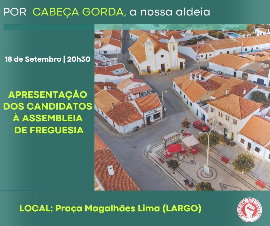 Junte-se a nós nesta noite especial. Venha 𝙘𝙤𝙣𝙝𝙚𝙘𝙚𝙧 𝙙𝙚 𝙥𝙚𝙧𝙩𝙤 quem quer trabalhar por Cabeça Gorda: os candidatos à Assembleia de Freguesia, à Câmara Municipal de Beja e à Assembleia Municipal de Beja.